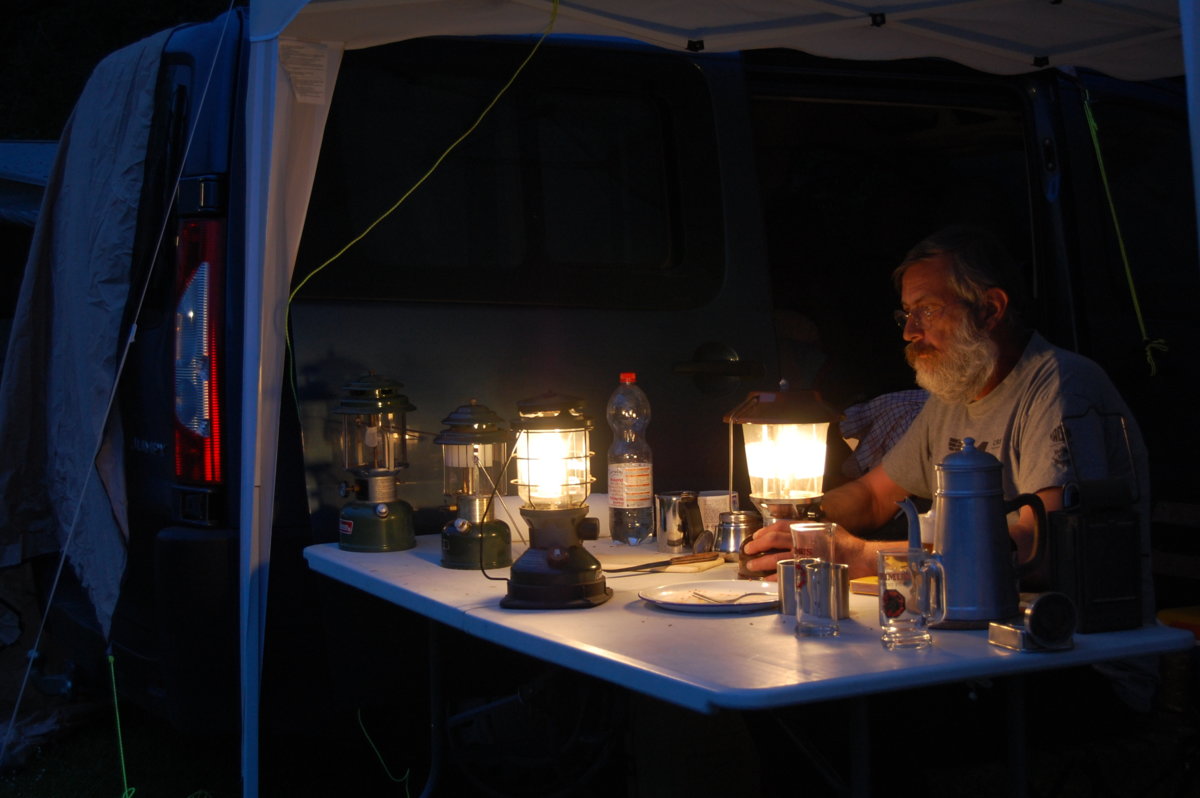 @nmp, I tend to find I only need a couple of stoves lit to make a good meal. Lampies struggle to find their way around in daylight and have a couple running just in case. My currently only functional lantern as the pressure ones didn't want to play this weekend. Oh and there's a stove in there somewhere.
