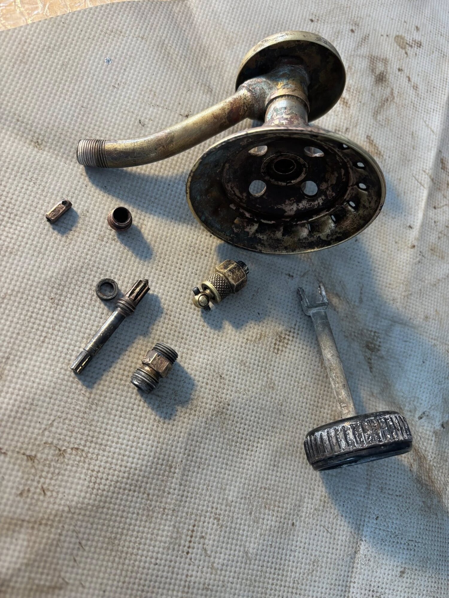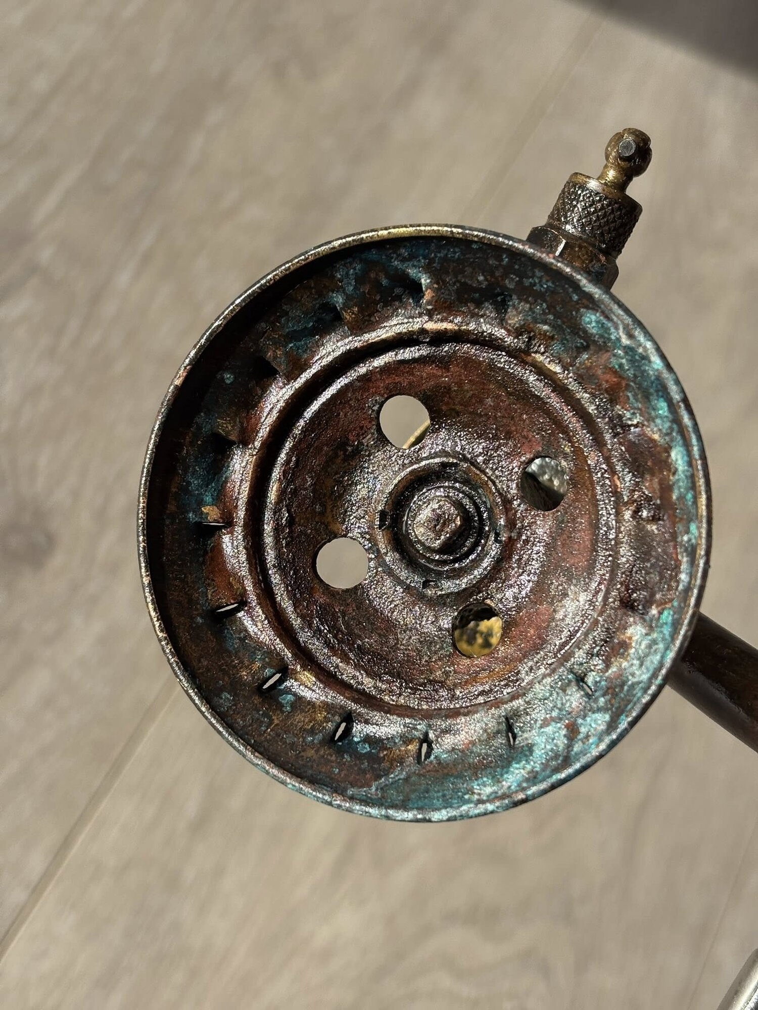 The burner was first given a bath in citric acid, and further a lot of grinding and polishing with a rotating wire brush, emery paper and steel wool was required.