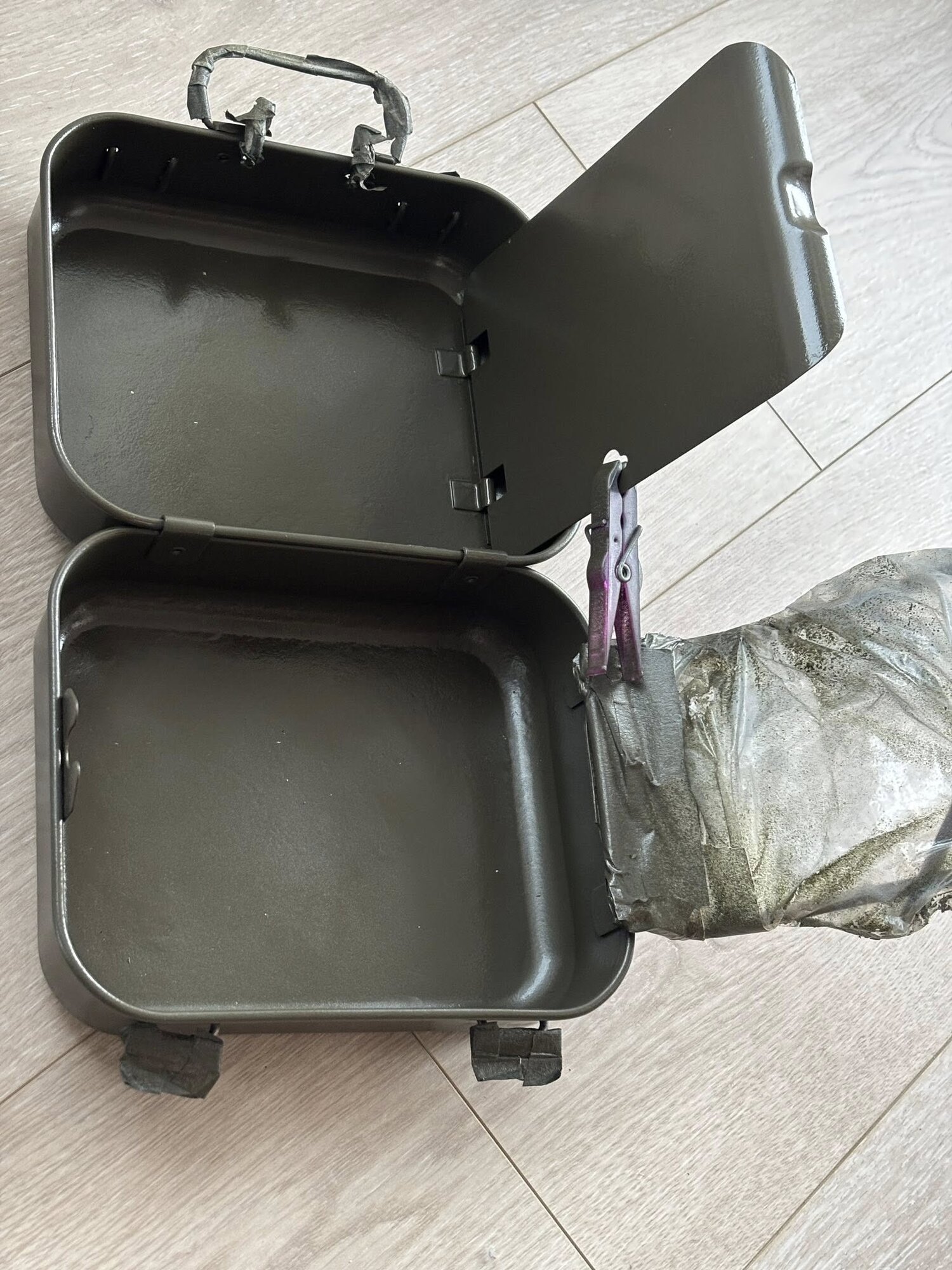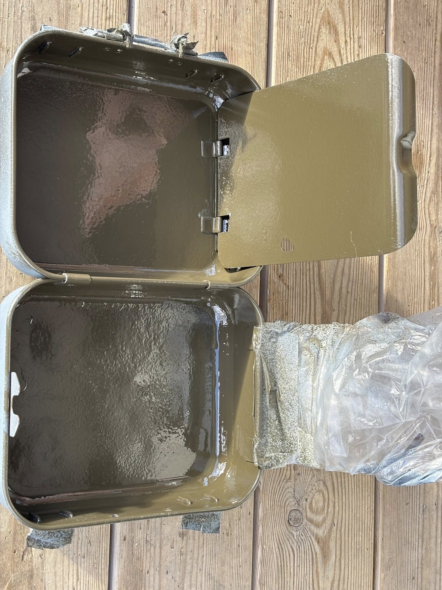 The tin was sanded down and first painted olive green. Then it got a coat of colorless matte paint as the first layer was very shiny. I think the resulting color and finish is close to the original.